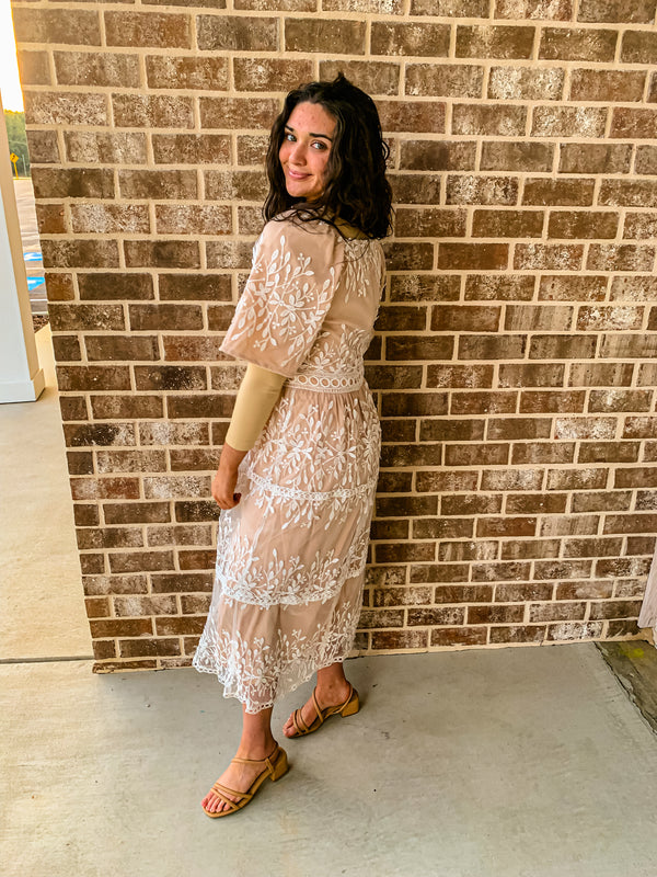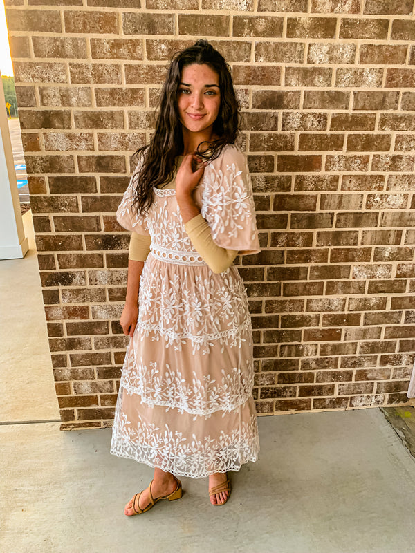 The dreamy dress is a stunning piece that exudes elegance and charm. Made with intricate crochet detailing, this dress is perfect for those who appreciate the beauty of craftsmanship. The cream color adds a touch of sophistication, while the flowing silhouette creates a dreamy and ethereal look. It is paired with our tan layering tee (Nikibiki).