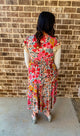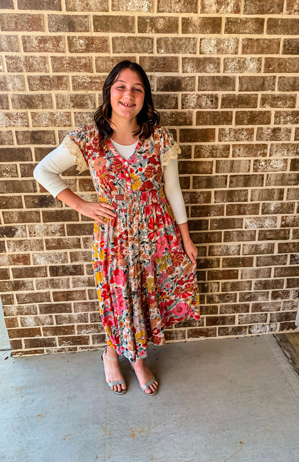 This dress is so cute! It’s very colorful with splashes of gold, pink, dusty blue, light pink, and a few more! It has a v-neckline with buttons in the front, and the sleeves are short with cute crocheted fringe lining them. The waist has elastic in it to help accent your waist, the dress is flowy at the bottom, and it has pockets! It fits true to size!