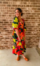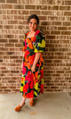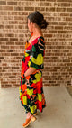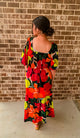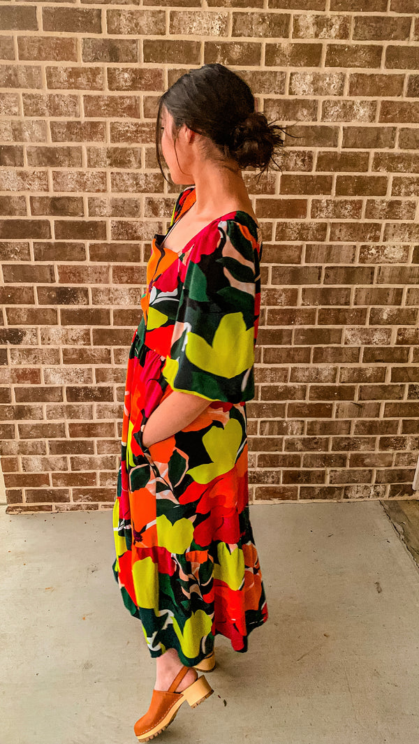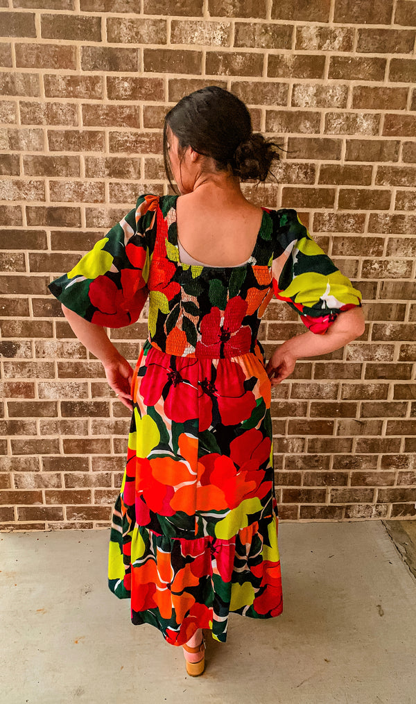 This dress is so cute! It’s very colorful, with a black background and dark pink, lime green, and orange flowers and splashes of white and dark green leaves throughout the dress. It has a square neckline in the front and the back, and the back is smocked. It has puffy elbow length sleeves, it has a flare at the bottom, and it has pockets! It fits true to size, and it’s the Oddi brand.