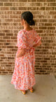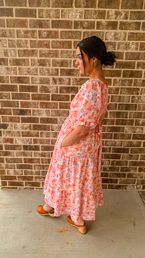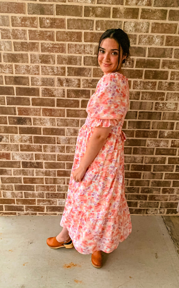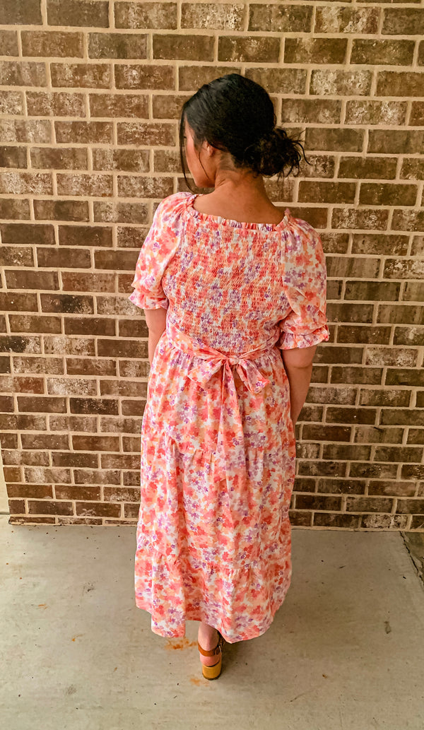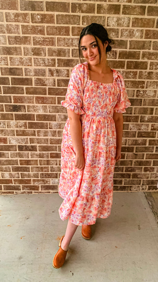 This dress is so pretty! It’s has a white background with pink, purple, orange, and peach mini flowers covering the dress! It has a square neckline, with a smocked back, short sleeves with a cute ruffle on the end, it has a flare at the bottom, and, lastly, it has pockets! It fits true to size!